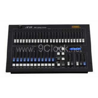 24 channel faders x 2 pages, 12 submaster faders x 3 pages, 1 chase speed fader, 1 chase cross fader, 1 channel master fader and 1 master fader.