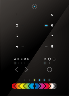 Touch-sensitive panel with 25 pages of 8 scenes, 2 DMX OUT universes (1024 channels).